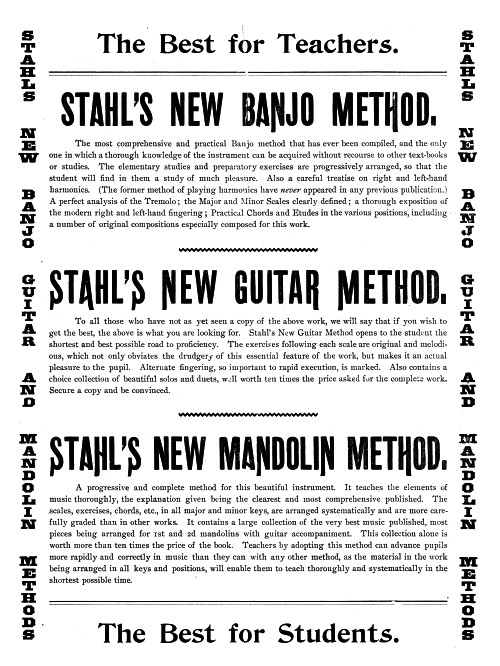 Information about William C. Stahl from http://www.banjoukes.com/Manufacturers/Wm.C.Stahl/Stahl.html: William C. Stahl was born in 1869, and became interested in music at an early age. He learned to play banjo and, while still a teenager, composed a banjo solo that was published by S. S. Stewart. Music became his profession, and after teaching for a few years he established a company in Milwaukee that manufactured instruments and published music. He claimed to be the first maker of tenor banjos. In addition to the instruments Stahl built, he also had them built by other companies, including the famous Larson Brothers, under the Stahl name. William C. Stahl's International Banjo Method is available as download at:http://www.classicbanjo.com/tutor.phpWilliam C. Stahl’s New Method for Tenor Banjo by William C. Stahl (1919) is available at: |