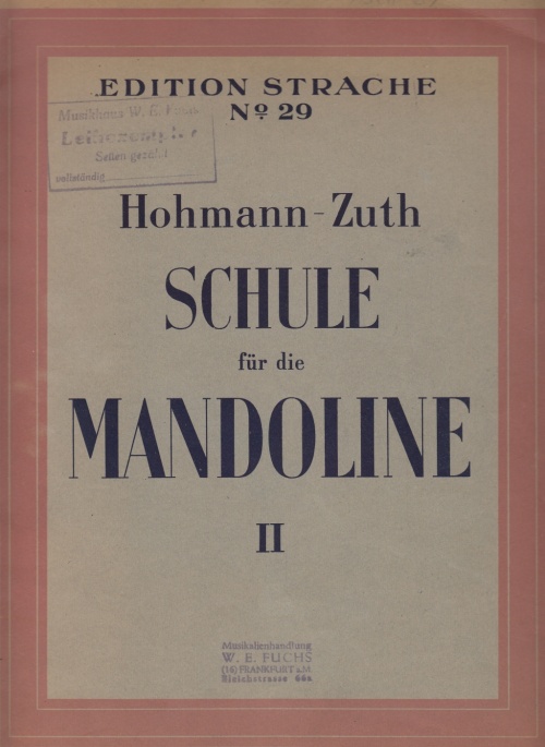 "Österreichischen Tageszeitung" sowie der "Reichspost". Zuth gab "Das künstlerische Gitarrespiel" (1920), "Gitarrekompositionen des Grafen Losy" (1921), "Ferdinando Carullis Gitarrenschule" (1921) sowie "Volkstümliche Gitarreschule" (1922) heraus und veröffentlichte ein Handbuch der Laute und Gitarre (1926–1928). Ein paar Hinweise zu Josef Zuth findet man auch auf der Seite des Neuen Favoritner Mandolinen Orchesters (Wien): http://www.mandolinen.at/index.php?id=116Vor einiger Zeit habe ich durch Zufall diese Mandolinenschule entdeckt. Es handelt sich um eine Bearbeitung der Violinschule von Christian Heinrich Hohmann für die Mandoline die 1930 erschienen ist. Leider besitze ich nur den 2. Band dieser Schule. |