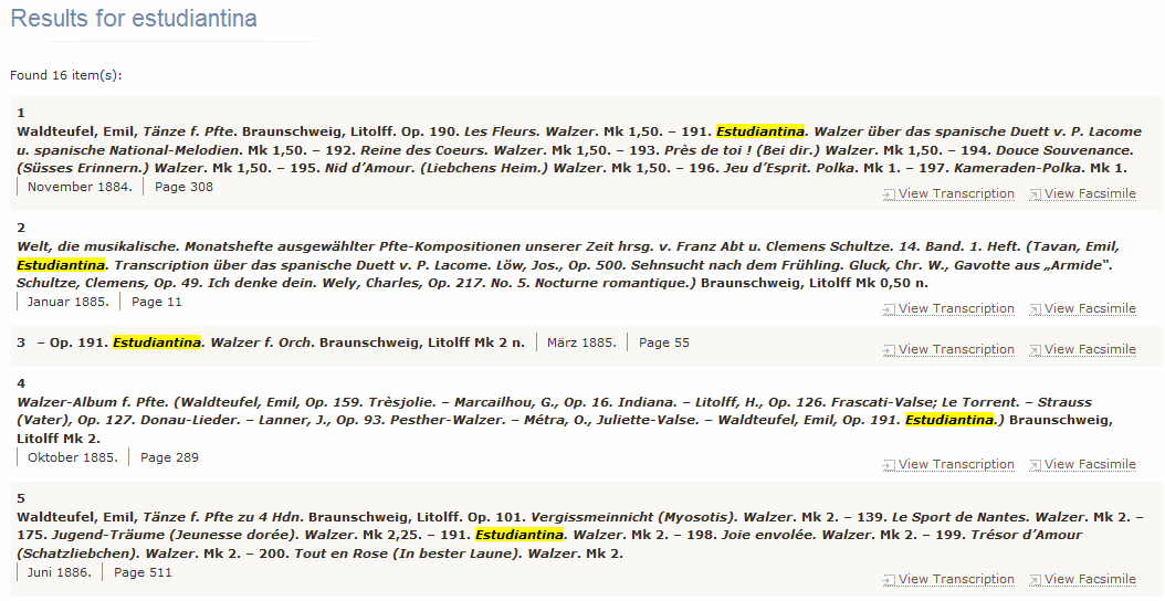 Jean PietrapertosaJean Pietrapertosa hat eine Mandolinenschule und viele Kompositionen und Bearbeitungen veröffentlicht. Die früheste Erwähnung von J. Pietrapertosa in der Hofmeister XIX Datenbank ist 1889 (sieh unten), seine Schule hat das copyright von 1892. Ich habe gerade zwei alte Notanausgaben von Pietrapertosa gekauft. Das erste Stück ist eine Fantasie über Melodien aus der Oper Faust von Ch. Gounod. Das zweite Stück ist Estudiantina - Fantasie espanol sur le célèbre Duo de P. Lacome. Emil Waldteufel hat 1884 seinen Walzer Estudiantina nach der Melodie von Lacome und weiteren spanischen Melodien veröffentlicht. Auf der Seite http://www.planet-vienna.com/musik/komponisten/Waldteufel/werke.htm findet man den folgenden Hinweis: Anmerkung: Wie auch bei ‚España‘ handelt es sich bei ‚Estudiantina‘ um ein Arrangement, welches aus bereits bestehenden Themen anderer Komponisten besteht. Der Verleger Enoch beauftrage Waldteufel, einen Walzer zusammenzustellen, der auf dem berühmten Duett ‚Estudiantina‘ (Bezeichnung für eine Gruppe von Studenten) von Paul Lacome (1838-1920) basiert. Dieses Thema jedoch reichte nur für die ersten eineinhalb Sequenzen von ‚Estudiantina‘. Daher suchte Waldteufel weiter in der Vielfalt der französischen Adaptionen original spanischer Lieder. Die vier Walzerthemen von ‚Estudiantina‘ beinhalten folgende Lieder: 1. Estudiantina (Refrain), 2. Estudiantina (Strophe) und ‚Chanson d’automne‘ (ebenfalls von Lacome), 3. ‚Jota de la Estudiantina‘ und ‚Tirana‘, 4. ‚De Cadiz al Puerto‘ und ‚El Tripili‘. Lacomes ‚Estudiantina‘ wurde im Dezember 1881 veröffentlicht, Waldteufels Walzer im April 1883. Wie auch ‚España‘ ist dieser Walzer ein Muster an Lebhaftigkeit. Die wunderbaren, zügig dahinfliessenden Melodien befördern den Zuhörer geradewegs auf einen wogenden Wellenteppich, welcher ihn für einen Moment in den sonnigen Süden bringt... Ob es sich bei der Komposition von J. Pietrapertosa um eine Bearbeitung des Walzers von Waldteufel oder um eine eigene Bearbeitung des Walzers von Lacome handelt habe ich noch nicht herausgefunden. Kostenlose Note von Estudiantina von Emil Waldteufel: http://imslp.org/wiki/Estudiantina,_Op.191_%28Waldteufel,_Emile%29 siehe auch: |