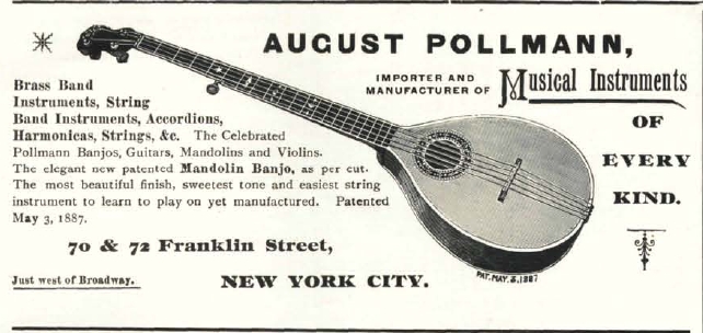Brass Band, Instruments, String Band Instruments, Accordions, Harmonicas, Strings, &c. The Celebrated Pollmann Banjos, Guitars, Mandolins and Violins. The elegant new patented Mandolin Banjo, as per cut The most beautiful finish, sweetest tone and easiest string instrument to learn to play on yet manufactured. Patented May 3, 1887.