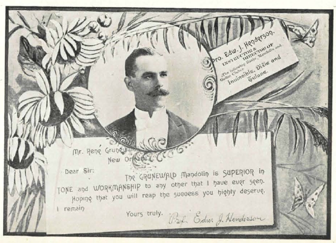 RENE GRUNEWALD.Within the past decade New Orleans has made rapid advances in all lines of manufacture, and it seems that the name of Grunewald is to be prominently associated with the manufacturing interests of New Orleans as it has been in the past in a commercial sense. It was Rene Grunewald who realized the importance of New Orleans as a manufacturing center for musical instruments. The geographical location of the city gave it a decided advantage as a distributing point. It was in '94, when he purchased lots on Conti street, where he immediately commenced the erection of a large and spacious brick building, which was to be particularly constructed for the manufacture of mandolins. Mr. Grunewald having been associated with the music business in a retail way the greater portion of his life, knew precisely what the people needed in mandolins. After completing his factory at 818-22 Conti street, he placed therein the latest wood-working machinery, suitable for all the intricate carving, sawing and boring" which is necessary in the construction of mandolins. This machinery was made especially for Mr. Grunewald. His next move was to secure the best skilled artisans from the South and from Europe. He then commenced the manufacture of the Grunewald mandolin. From its very inception the Grunewald mandolin proved a success, and has become a vast favorite with the people of New Orleans and vicinity. As his product became wider known, the demand was constant and steady from outside towns and cities for the mandolin which bore the name of Grunewald and the stamp of the Crescent City. Live music dealers in the South quickly saw the selling qualities of these mandolins, and bought them in goodly numbers—in fact, the remarkable business which Mr. Grunewald has built up in so short a time can only be attributed to the excellent class of work which comes from his factory. It is his thorough knowledge of the music business, his close acquaintance with the trade, and the personal supervision which he gives to every detail of his factory that enables Mr. Grunewald to give to his customers such a pleasing line of musical instruments. He now manufactures over nineteen different styles of mandolins. It is possible that in the near future he will add to this the manufacture of guitars and drums; as well as other musical instruments. Dealers who have not seen the Grunewald mandolin should lose no time in placing a sample order. Already these goods have been shipped as far north as Milwaukee, and everywhere have given satisfactory results. Rene Grunewald has made a careful study of natural woods of which he makes a specialty. These are shipped direct to him from Mexican and South American ports. His knowledge of woods is thoroughly appreciated by some of the Northern manufacturers, who have purchased from Mr. Grunewald a large number of mandolin necks and finger boards. In a recent conversation about woods and where purchased, the proprietor of the lirst mandolin factory in New Orleans said: "Here is a fair sample of mahogany," continued Mr. Grunewald, pointing out a large pile of the beautiful wood; "Spanish cedar, direct from Bocas del Toro, Colombia, while here is an oddity in wood— figured cypress. "Now, the idea struck me to turn out mandolin necks of various designs and woods, and samples have been sent to various factories North, East and West, and many orders have already been the result. "With wood laid down on our wharf and turned out properly, there is no reason why it will not be advantageous to distant factories to buy direct from me, avoiding the expense of handling the log in the rough by rail and afterward by machinery. It goes to say that having all advantages to obtain necessary material direct, the saving in freight and handling, we can manufacture necks, bodies, or the mandolin complete, at a lower rate than any factory in the United States. "Factories throughout the country, if not realizing this altogether, have some exceptions, and a number of orders for 'necks' are already on file and are being prepared for shipment. These, you see, are of perfect workmanship and the finest of material, and I am satisfied cannot be duplicated for the money in any factory of the country. " Rene Grunewald has the same genial traits which are the main feature in all the Grunewalds. Aside from a personal supervision of his factory, he is associate director in the L. Grunewald Co. On the opposite page we present to our readers a reproduction of a few of the many testimonials given to Rene Grunewald by eminent musicians of New Orleans. A perusal of these will show how highly the Grunewalds are appreciated by men who have gained a national reputation as musicians. The indorsements speak eloquently for the musical qualities of the mandolins, and certainly must be very pleasing to Rene Grunewald to have attained such lecognition on the qualities of his musical instruments. Source: http://mtr.arcade-museum.com/MTR-1895-20-16/28/ and http://mtr.arcade-museum.com/MTR-1895-20-16/29/ More articles about René Grunewald: http://mtr.arcade-museum.com/MTR-1897-24-14/35/ http://mtr.arcade-museum.com/MTR-1898-27-11/09/ http://mtr.arcade-museum.com/MTR-1895-21-18/15 http://mtr.arcade-museum.com/MTR-1895-21-18/18/