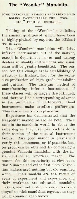 The "Wonder" Mandolin.SOME TRENCHANT REMARKS REGARDING MANDOLINS, PARTICULARLY THE " WONDER," FROM AN EXCHANGE. Talking of the "Wonder" mandolins, the musical qualities